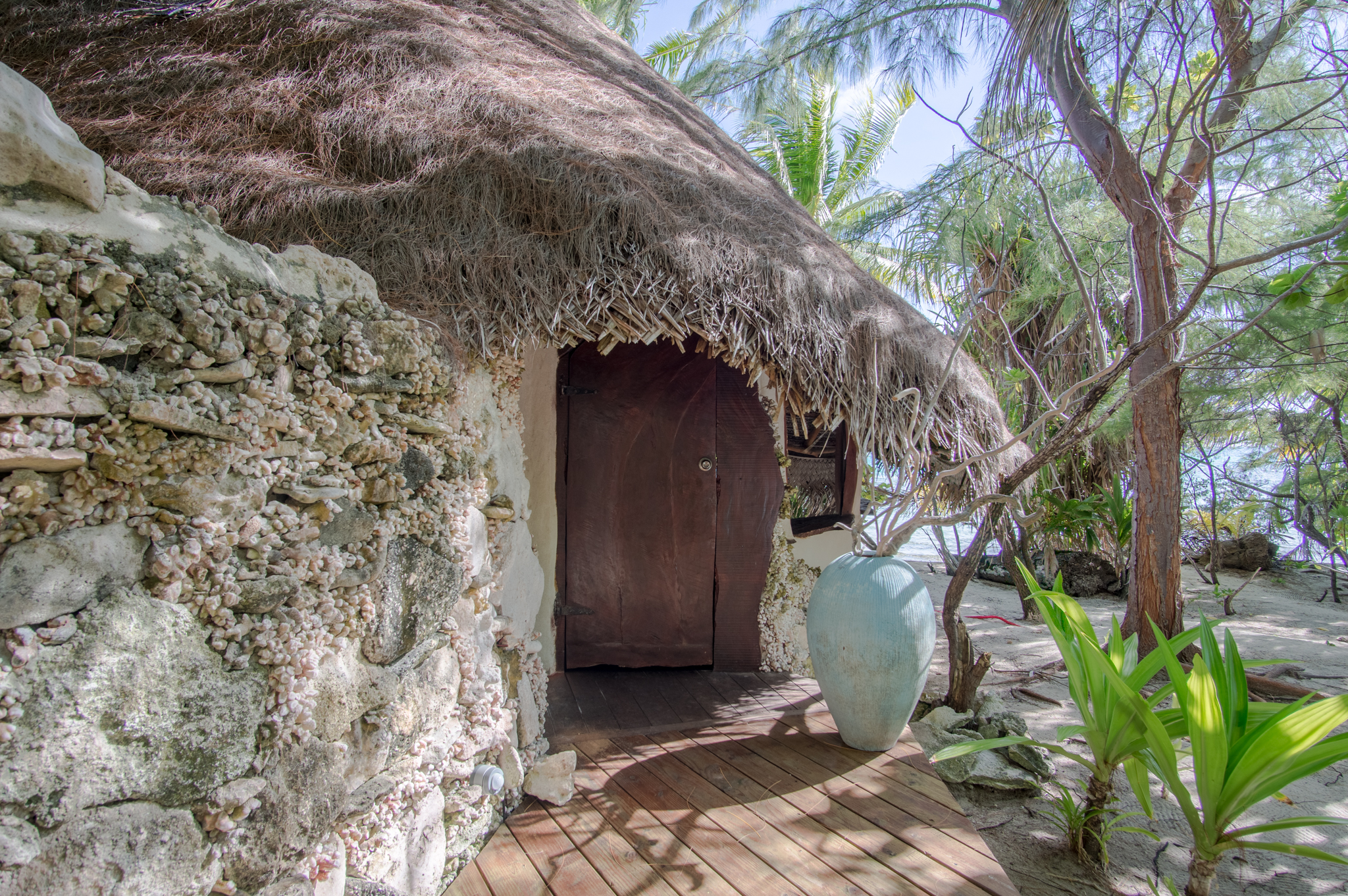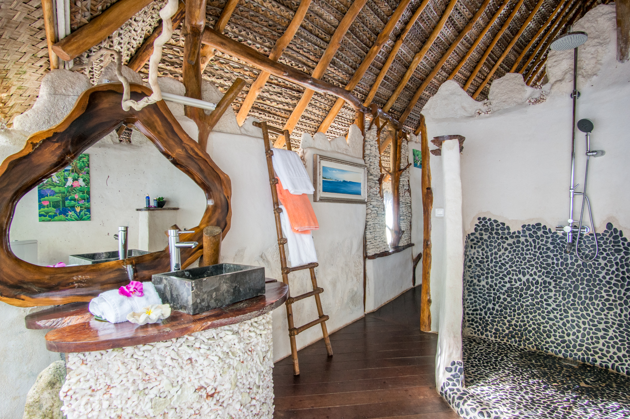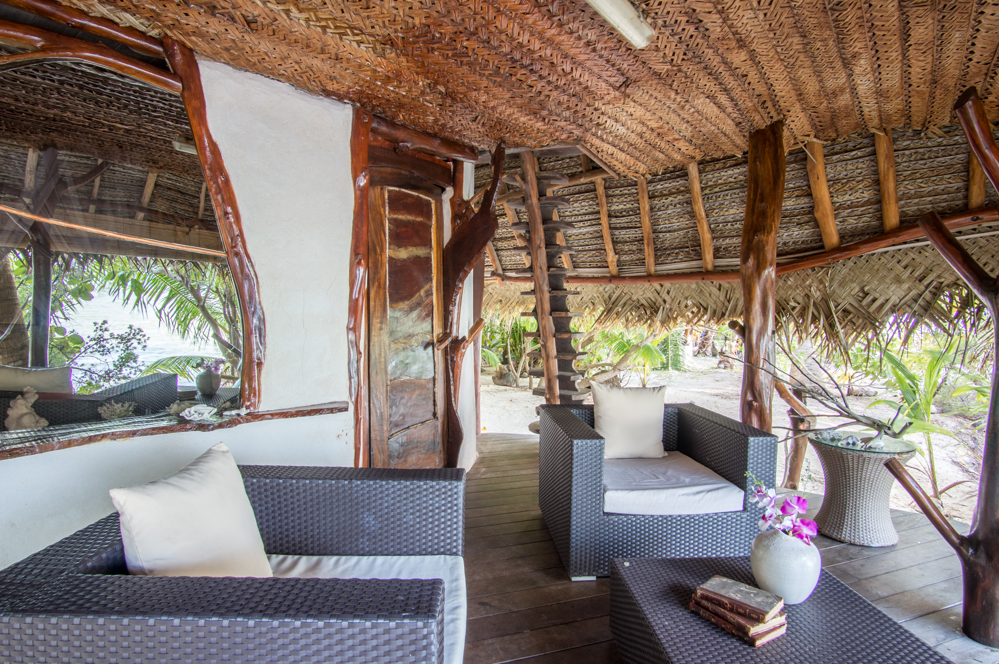 Kaveka is a two story waterfront bungalow with a covered outdoor deck and private beach access offering stunning views of the surrounding garden and the sea. It sleeps up to 4 guests, both sleeping areas come with either a queen or two single beds. The standard configuration has two single beds in the double height space on the ground floor and a queen bed in the open upstairs loft. The private bathroom is accessed from the common area on the ground floor and is open to a small outdoor garden courtyard.