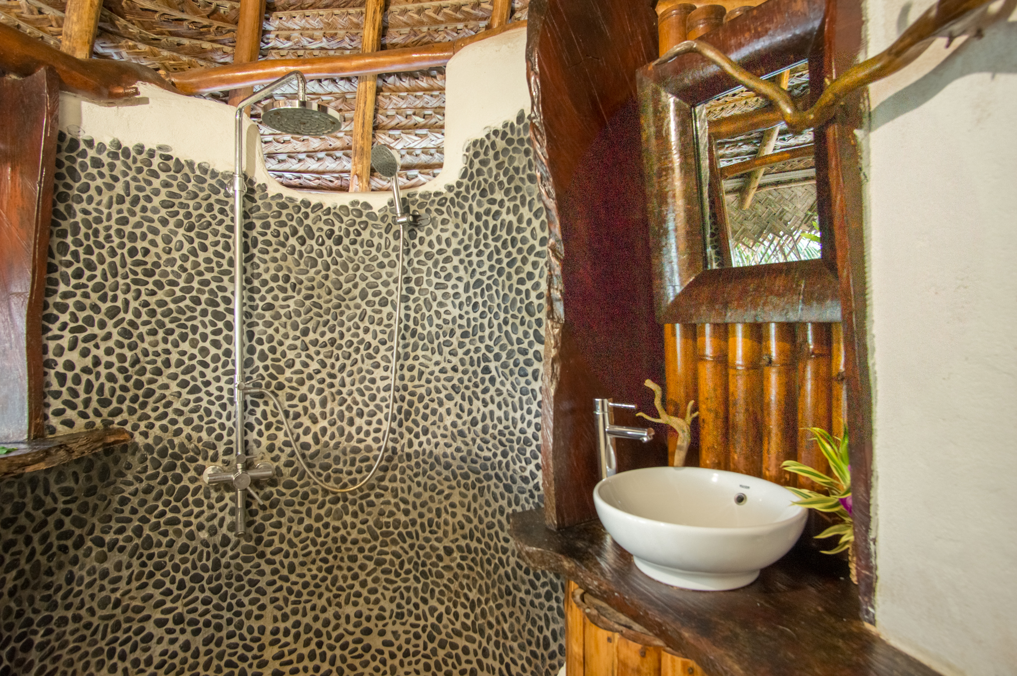 Miki Miki is a waterfront bungalow with a covered deck and private beach access sleeping up to two guests. The bedroom with adjacent bathroom are located above the deck and accessed through an exterior stair. The spaces offer direct sea views, and the outdoor living room on the ground floor invites to relax and read books surrounded by nature.